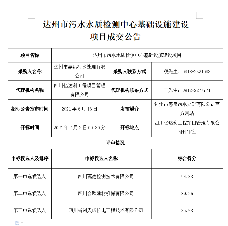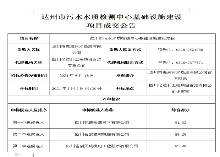 標題:達州市污水水質檢測中心基礎設施建設項目成交公告